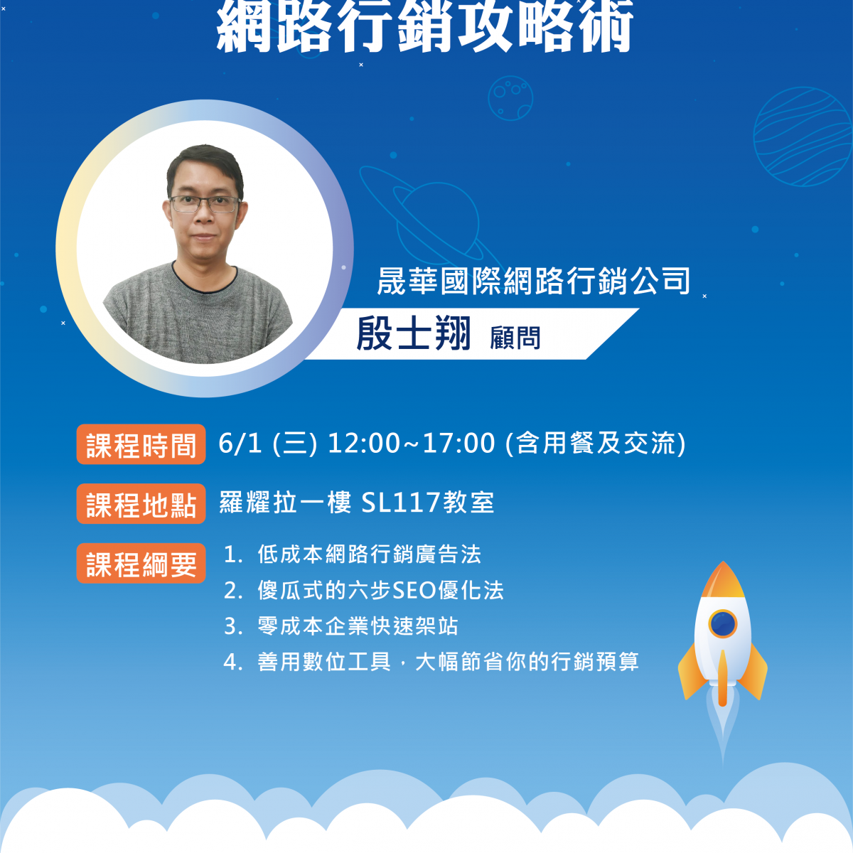 【課程名稱】網路行銷攻略術 【日期時間】 111年6月1日(三) 13:00-17:00 (含用餐及交流) 【授課地點】線上連結:https://reurl.cc/k1akOr 【課程綱要】